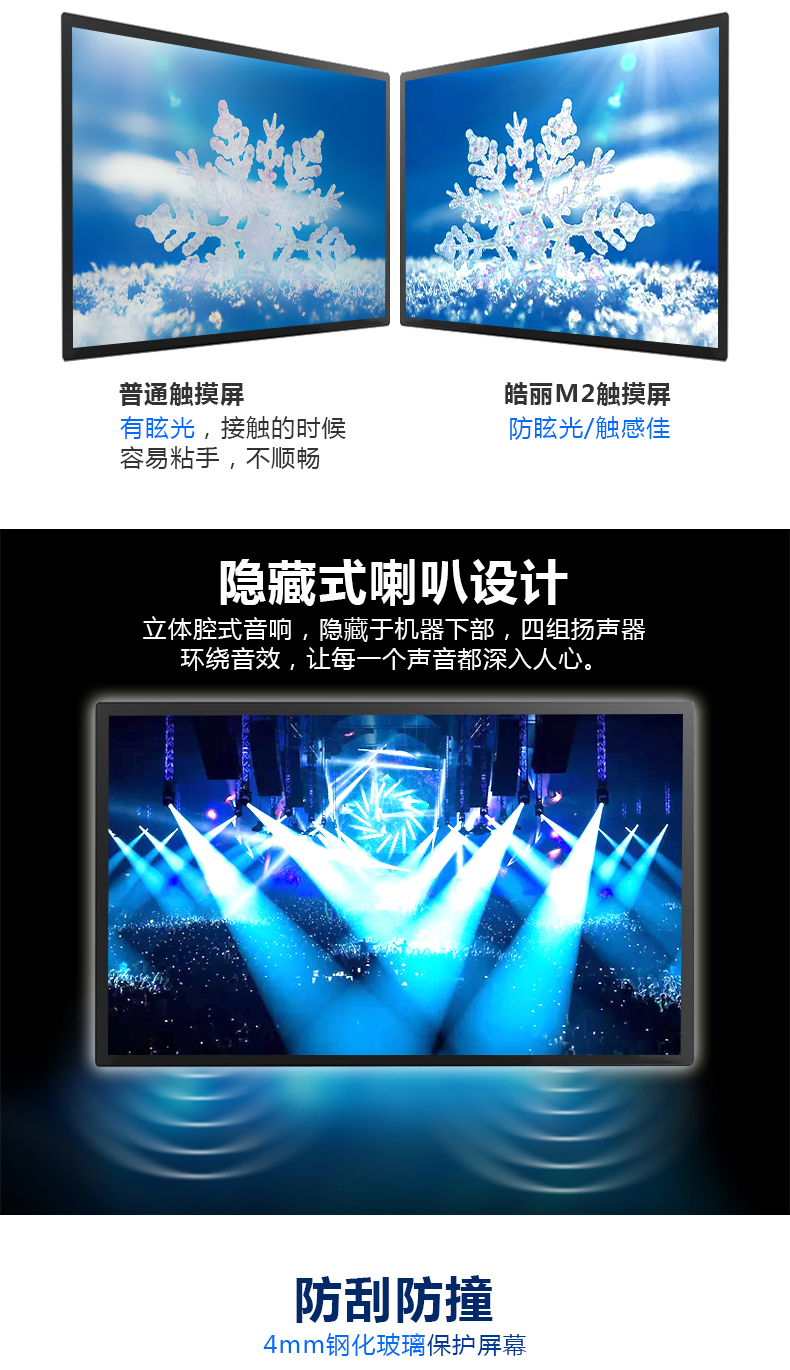6、鋁合金外框,表面拉絲并陽極氧化處理,鐵殼后蓋,主動散熱; 7、4mm物理鋼化防暴高透玻璃;加強視覺效果,提升觸摸體驗; 8、高速10點觸控書寫體驗,更好的圓滑度,更快的書寫速度; 9、超窄拉絲面框,超窄邊設計,整機面框單邊寬度只有25mm; 10、使用國際通用標準的OPS插槽,一體化插拔式設計,方便升級與維護,外部無可見電腦模塊的連接線,機身美觀; 11、正面前置式擴展端口:1路PC-USB /1路TV-USB /1路HDMI /1路TOUCH-USB接口,方便用戶拓展使用; 12、前置三合一 電腦開關按鍵,一體化設計,既能在臨時不用此設備的時候,集中學生注意力;又能節(jié)省能源,節(jié)能環(huán)保,同時還延長機器壽命,這樣設計還方便用戶使用; 13、按鍵前置,便于嵌入式安裝,并支持童鎖,通過設置可屏蔽按鍵功能,以免誤操作; 14、喇叭出音前置,防止因內嵌式的環(huán)境導致聲音效果變質; 15、帶RS232接口,方便擴展視頻展臺等其他設備; 16、觸摸屏具有防遮擋功能,單點或多點遮擋后仍能正常流暢書寫; 17、自帶嵌入式安卓(Android)5.1,操作系統(tǒng)雙系統(tǒng)安全備用,方便老師操作; 18、中控觸摸菜單:脫離android系統(tǒng)和PC,通過手勢操作可以調出便捷菜單,實現(xiàn)返回觸控、便捷菜單、通道切換、白板操作功能; 19、支持溫控功能,隨時可以知曉整機溫度,設置溫度預警,保護整機,當整機達到80度,整機將進入待機模式; 20、無線遙控功能:設計具備 遙控功能和電腦鍵盤常用的F1—F12等功能等組合按鍵,方便課堂教學控制,支持PPT課件翻頁筆功能,能夠遠程進行上下翻頁,方便教學; 21、安卓熱鍵功能:懸浮式快捷鍵,可以放置在安卓桌面的任意位置; 22、支持APK安裝以及所有APK權限管理,可以預設APK使用權限,允許或者禁止使用已安裝的應用 23、安卓界面可以顯示進入安卓前信號通道顯示內容,支持畫中畫功能; 24、支持任意通道下觸摸菜單,含有:返回、安卓主頁、運行程序、信號源選擇、菜單、批注、音量調節(jié)、靜音、節(jié)能模式、觸摸菜單隱藏、等觸摸選項; 25、安卓默認瀏覽器導航:支持瀏覽器導航設置,方便使用查詢相關信息 |
