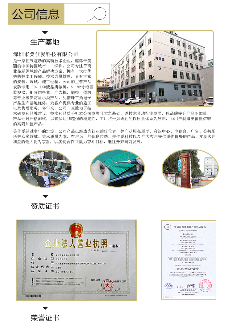 【深圳市美佳愛-液晶廣告機,觸摸一體機生產廠家電話400-997-9971】壁掛高清單機/網絡廣告機產品通過ISO9001_3C認證,主營多點紅外/電容式觸摸屏一體機,觸控查詢一體機,其他尺寸18.5寸21寸24寸27寸32寸40寸43寸46寸49寸55寸65寸75寸86寸98寸100寸多功能多媒體教學會議一體機,戶外立式/壁掛雙面廣告機,單機版/安卓網絡廣告機 豎屏樓宇電梯廣告機,長條型屏,工業級工控電腦觸摸顯示器,大尺寸觸摸屏查詢系統,商顯平板電腦電視,提供報價價格,安裝施工,售后維修等